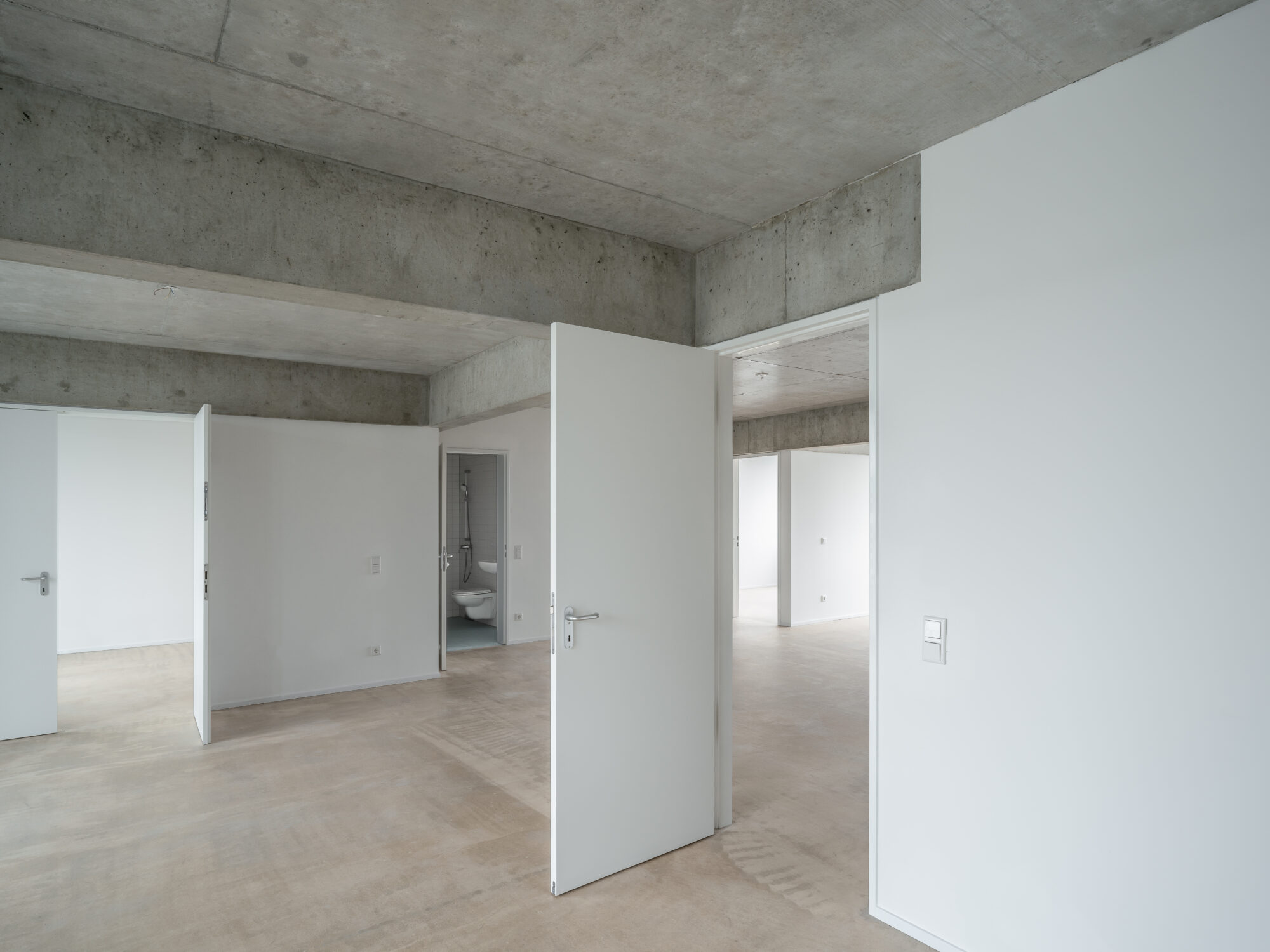 ‘San Riemo’ is the first housing project realised by the KOOPERATIVE GROSSSTADT, a cooperative founded in 2015. It is designed as a spatial infrastructure that allows for pluralistic forms of living within one robust basic structure. The possible plan of the apartments is outlined by concrete beams on the ceiling: room-units have a neutral size of 14 square meters – just big enough for a living room and not too lavish for a child’s room. Larger rooms are created by combining several room axes into one unit.