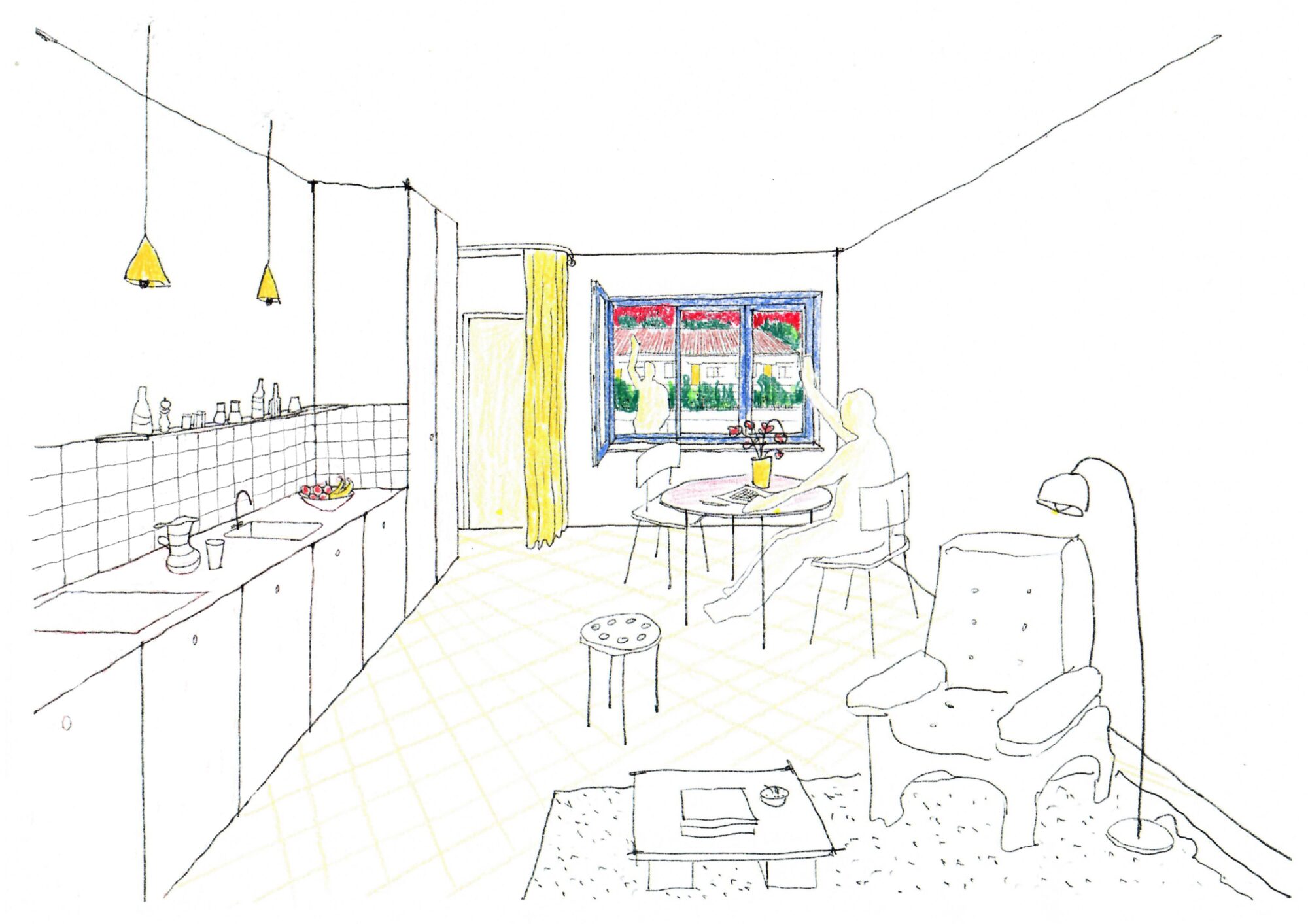The large kitchen in the center of every unit is not purely a place for cooking, but at the same time a living entrance hall and large distribution space that allows for a non-hierarchic organization of the surrounding rooms. The spatial variety arises as the structural grid is filled with non-load-bearing drywalls. The residents themselves decided which grid axes should be filled with walls, how open the connections between rooms are, and where doors are positioned. By adding doors between appartments, the possibility of swapping rooms with neighbouring flats was implemented in several units. Many appartments also share larger rooms with neighbouring flats: sometimes up to 4 to 5 appartments share a common room that can be freely programmed.