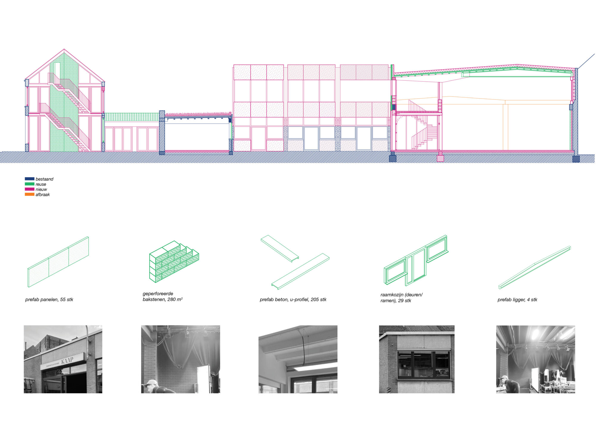VDK&C4 factory is a common work-, production- and above all meeting place for two small companies. The project is situated on the outskirts of the city on an industrial site dominated by concrete industrial halls. Without denying the context, the building on the prominent corner plot tries to counteract the anonymity of the surrounding buildings, creating a recognizable “place”. By shifting color, composition and form, typical elements and materials from contemporary industrial construction are abstracted, so that they acquire a new peculiar character. Heart of the building is a triangular courtyard, which breaks the rational rectangular shed, creating a collective meeting space and providing the interior spaces around with light and a view into the greenery. The garden divides the building into three parts: the joinery, the coffee roaster and a storage area. On top of the lower storage area is a communal roof terrace, which can be used by both parties.